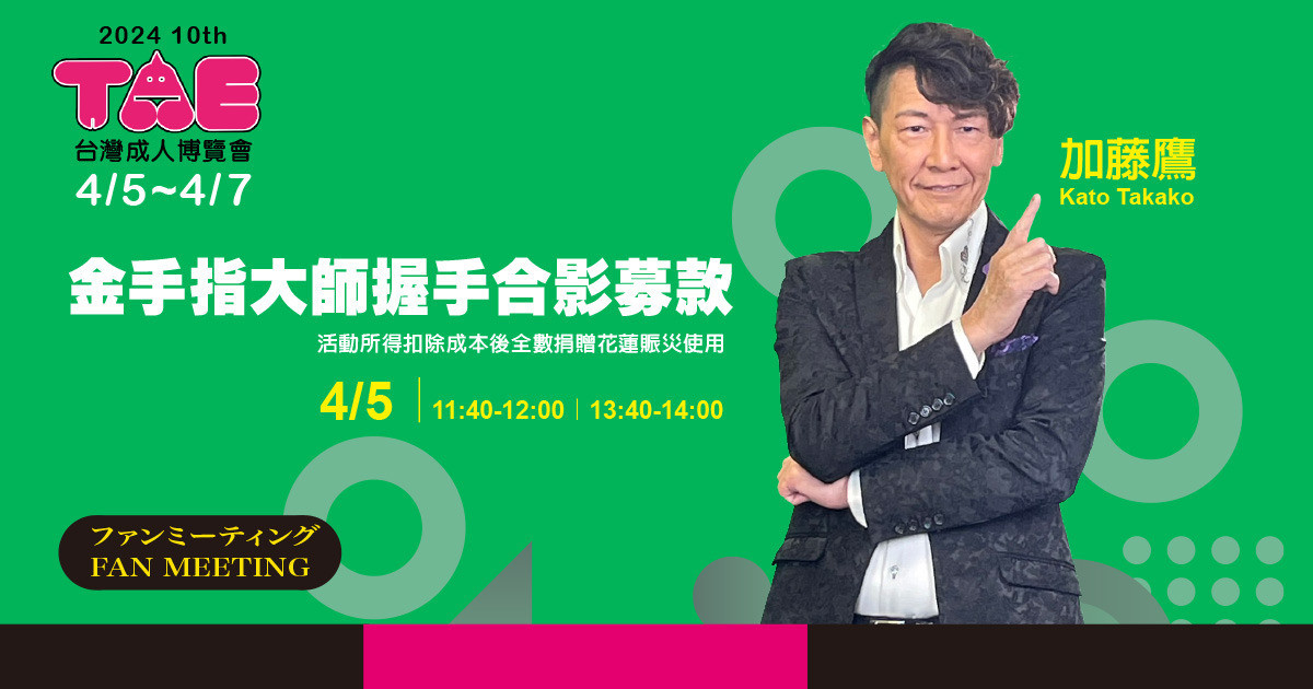 4月5日(五)金手指加藤鷹在TAE成人展“美夢成真”的攤位舉辦兩場握手合影會,獲得廣大迴響,特別加開4/6日11:30場次,限定20位粉絲,親握金手指大師,並能獲得3張手機合拍留念,活動所得扣除成本後全數捐贈花蓮賑災使用,期盼粉絲們報名活動與加藤鷹大師一起投入重建花蓮行列。